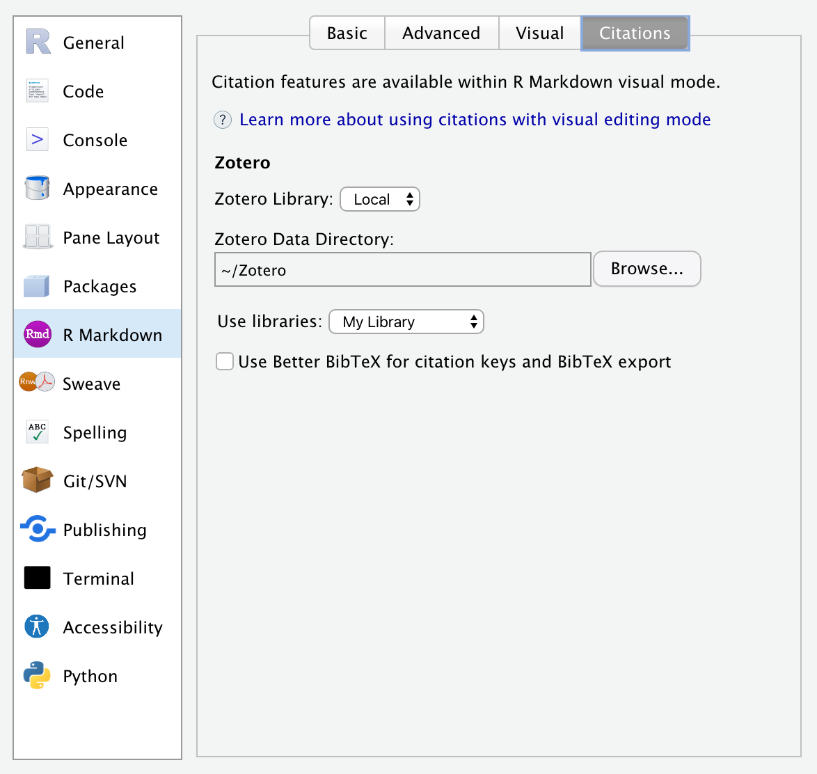 | Use Better BibTeX for citation keys and BibTeX export. | Optionally use Better BibTeX to generate citation keys and export BibTeX from Zotero (this option appears only if Better BibTeX is installed). |